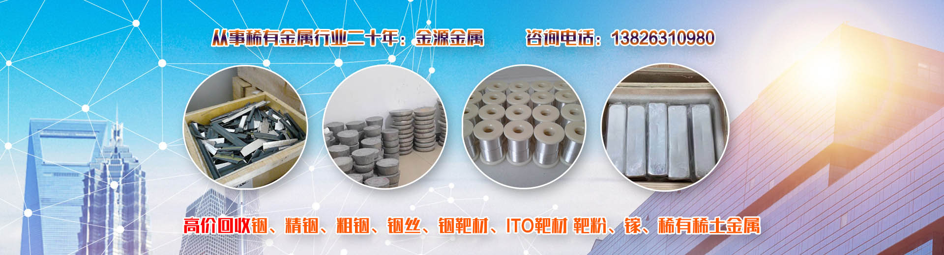 韶關(guān)市金源金屬材料有限公司坐落于中國(guó)廣東省韶關(guān)市,長(zhǎng)期收購(gòu)回收銦、精銦、粗銦、銦絲、銦靶材、ITO靶材靶粉、回收金屬鍺、鍺錠、鍺粉、鍺片、回收鍺單晶、單晶鍺、鍺粒、區(qū)熔鍺、工業(yè)鍺、廢鍺、鍺泥、鍺渣、二氧化鍺回收、四氯化鍺、有機(jī)鍺、銀、純銀、銀靶材、高價(jià)收購(gòu)回收ITO廢靶、回收廢銦、廢銦沙、廢銦渣、回收粗銦、廢銦絲、廢銦珠、廢銦箔、廢銦棒、收購(gòu)銀焊條、銀焊絲、導(dǎo)電銀膠、金屬鎵、硝酸鎵、氧化鎵、三氯化鎵、氯化鎵,供應(yīng)及回收氧化鎵、氫氧化鎵、碲化鎵,硒化鎵,銦粉,氧化銦、氯化銦、硫酸銦、硫化銦、醋酸銦、氫氧化銦、硒化銦,碘化銦,銅銦鎵硒,含金、銀、銦、銠、鈀、鎵、鍺等稀有貴金屬材料,稀土金屬材料、氧化鏑、氧化镥、氧化鋱、氧化鐠釹等回收。